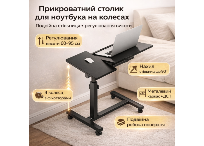 Прикроватний наддиванний столик T01 (64200) — мобільний функціональний стіл на колесах, призначений для роботи, читання та повсякденного використання біля ліжка або дивана.
