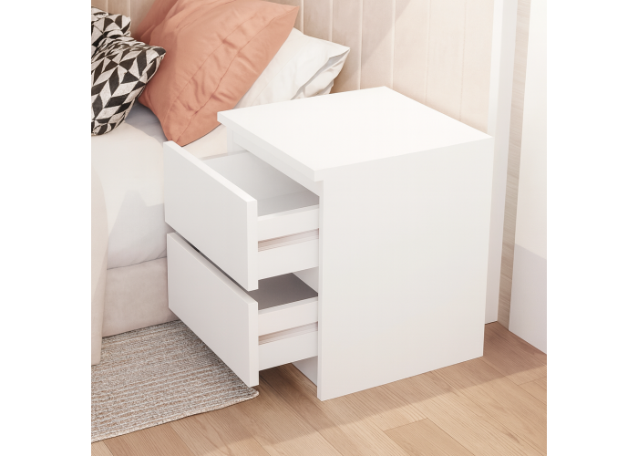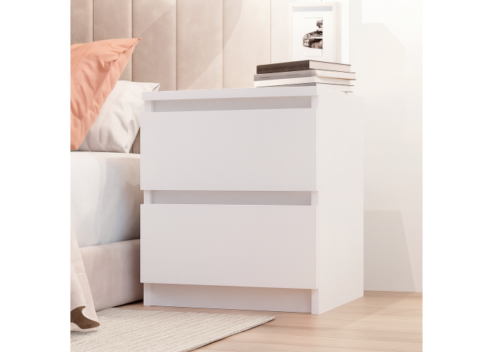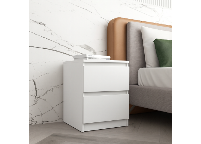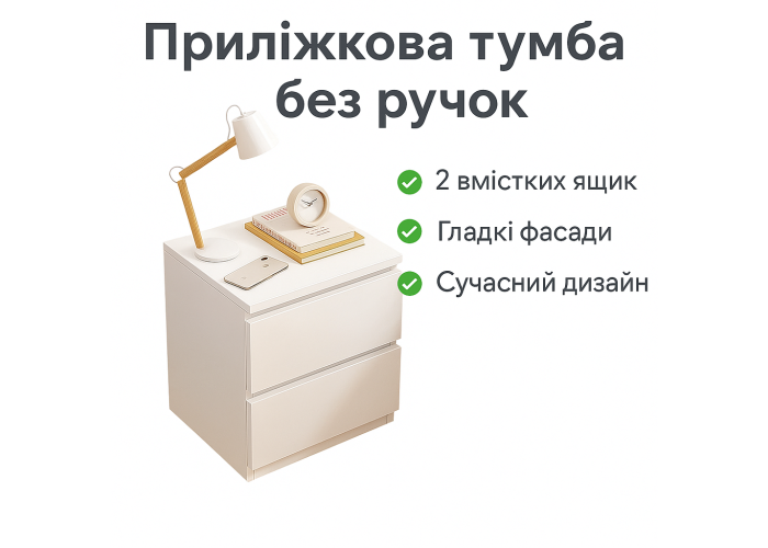 Приліжкова тумба без ручок — практичне й акуратне рішення для спальні в сучасному стилі. Компактні розміри дають змогу розмістити її навіть у невеликій кімнаті, а дві шухляди забезпечують зручне зберігання потрібних речей поруч із ліжком.