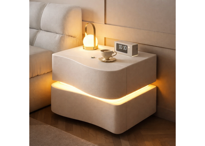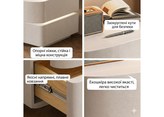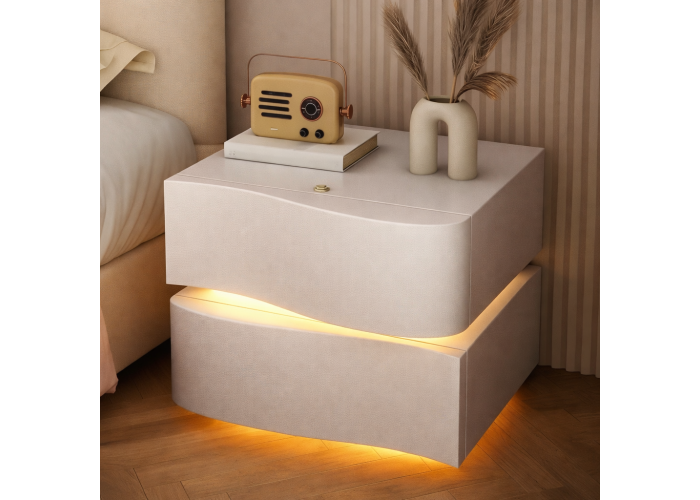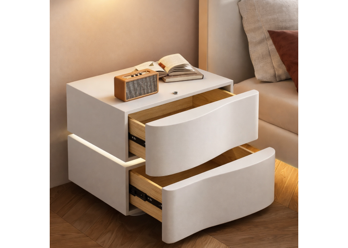 Сучасна приліжкова тумба для спальні, оснащена двома висувними шухлядами та вбудованою контурною LED-підсвіткою. Корпус повністю обтягнутий зносостійкою фактурною екошкірою. Завдяки продуманому дизайну без гострих кутів та м'якому теплому світлу, тумба поєднує в собі функції нічника та зручного органайзера для зберігання особистих речей, книг чи гаджетів біля ліжка.