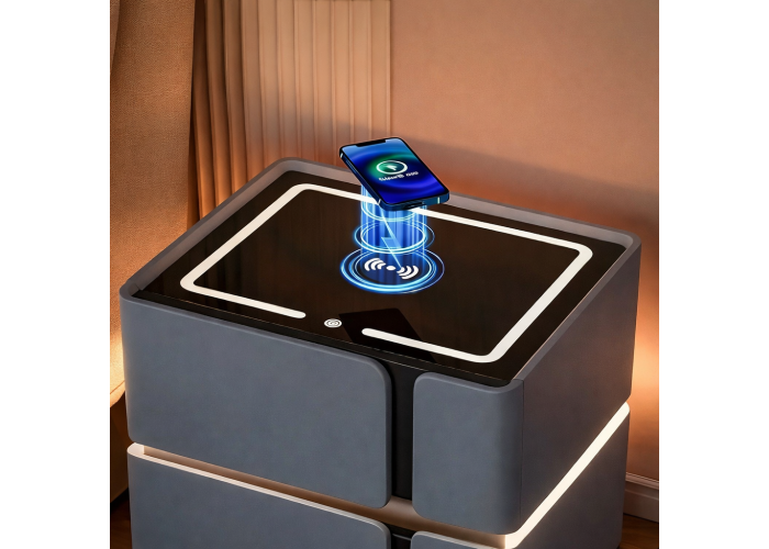 Заряджання пристроїв (USB): Вбудовані порти на бічній панелі й інтегрована зона на скляній стільниці дають змогу заряджати смартфони та планшети прямо біля ліжка без використання подовжувачів.