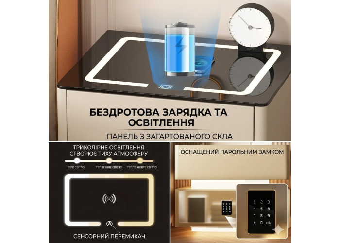 Система зберігання (2 секції): 1. Верхній висувний ящик — для зручного зберігання повсякденних дрібниць (книг, окулярів, кабелів). 2. Вбудований сейф (нижній блок) — обладнаний електронним кодовим замком на фасаді. Гарантує безпечне зберігання цінних речей, документів і готівок прямо біля ліжка.