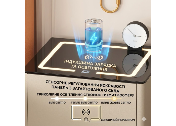 Заряджання пристроїв (бездротова + USB): На скляній стільниці передбачена вбудована зона для бездротового заряджання смартфонів. На бічній панелі розміщені класичні USB-порти для дротового під'єднання.