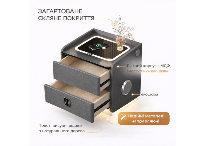 Розумна зарядка: Стільниця із загартованого скла підтримує швидку бездротову зарядку смартфонів. Також на бічній панелі передбачені порти USB та Type-C для заряджання кількох пристроїв одночасно.