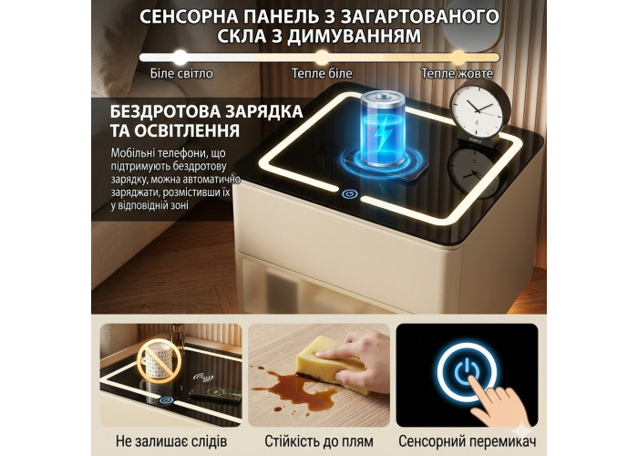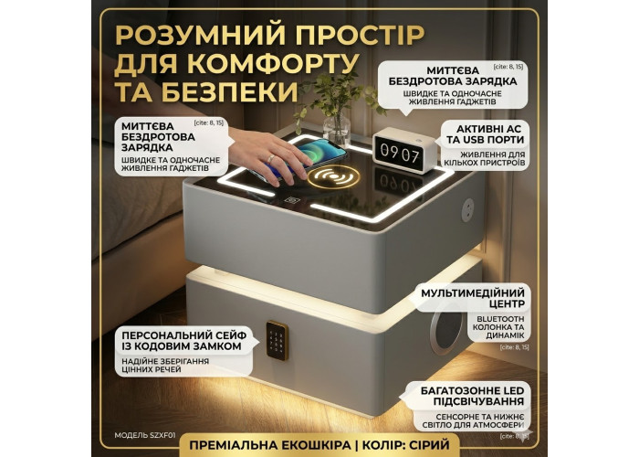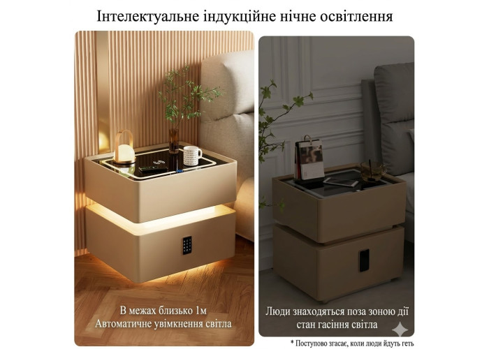 Система зберігання (2 секції): 1. Верхній висувний ящик — для зручного зберігання повсякденних дрібниць (книг, окулярів, кабелів). 2. Вбудований сейф (нижній блок) — обладнаний електронним кодовим замком на фасаді. Гарантує безпечне зберігання цінних речей, документів і готівок прямо біля ліжка.