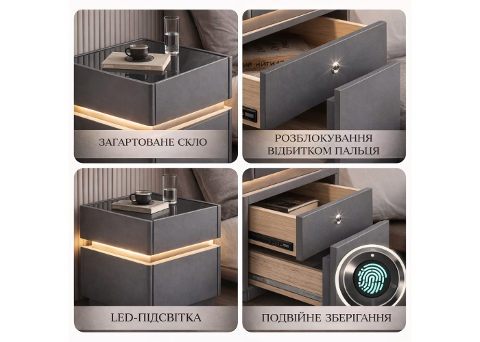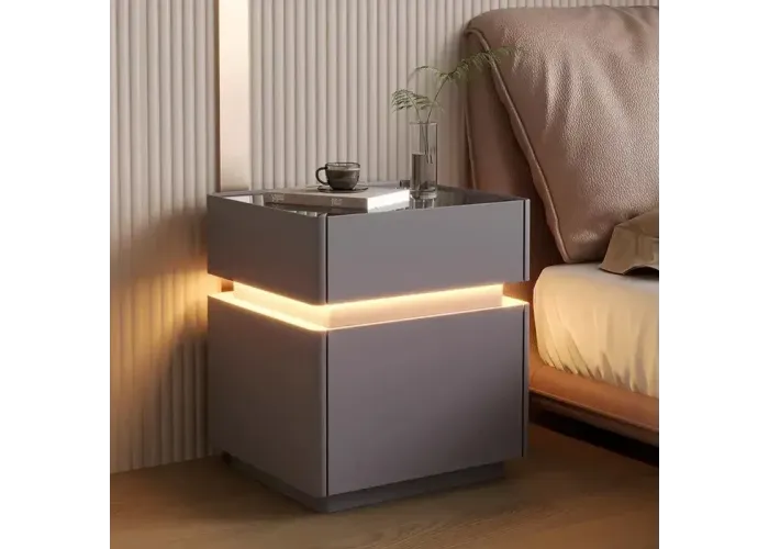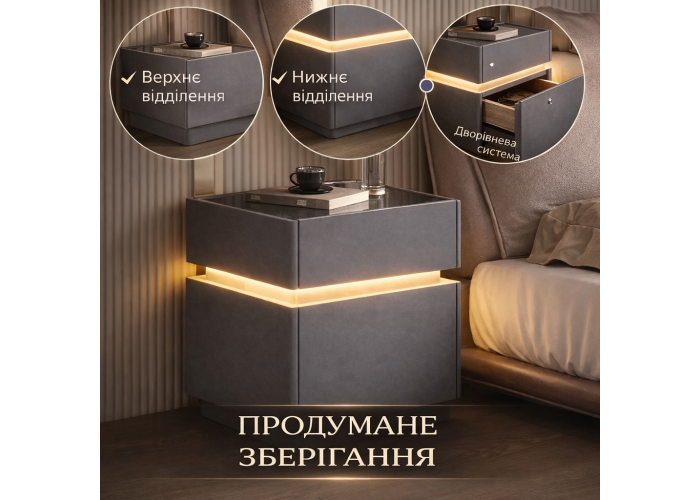 Сучасна багатофункціональна приліжкова тумба — це не просто меблі, а повноцінний технологічний центр комфорту у вашій спальні.Елегантна обробка з екошкіри надає інтер'єру преміального вигляду, а вбудована LED-підсвітка створює м'яку атмосферу затишку у вечірню пору.