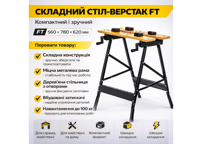 Складаний стіл-верстат FT — це зручне та практичне рішення для домашньої майстерні, гаража або дачі. Він поєднує в собі компактність, стійкість і функціональність, даючи змогу виконувати столярні, слюсарні та складальні роботи в комфортних умовах.