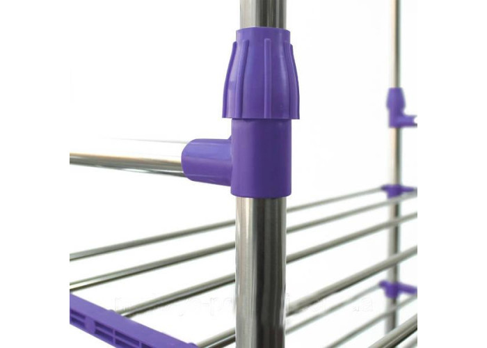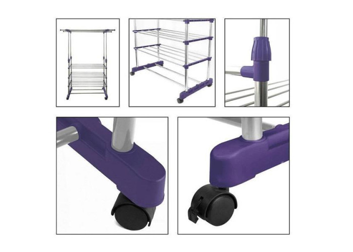 Стійка також має 3 великі полиці для одягу, взуття або інших речей. Вішалка виготовлена з міцних сталевих і хромованих труб.