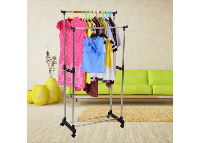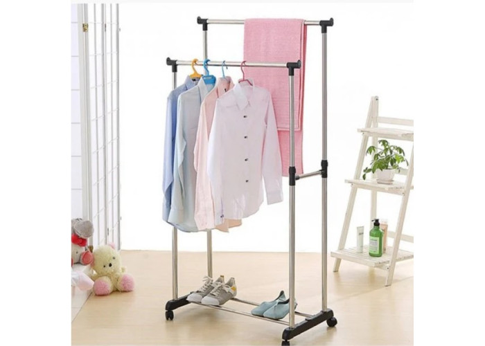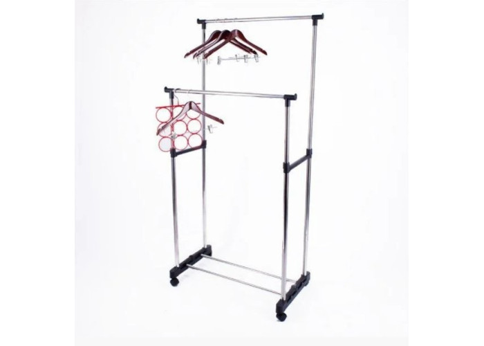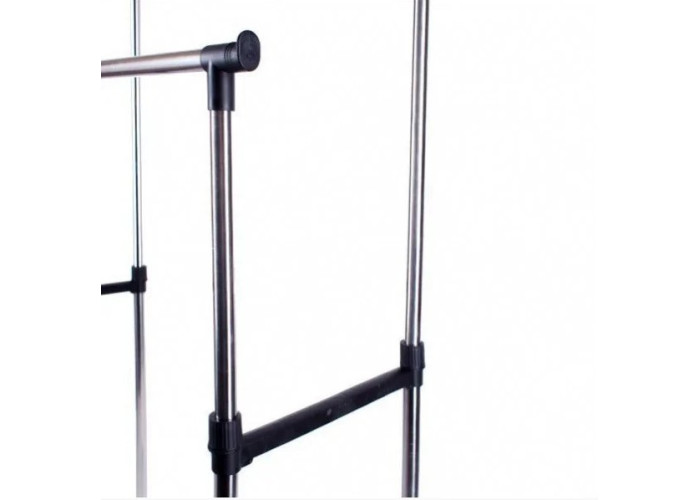Ви зможете пересунути стійку навіть повністю занесеним одягом. Стійка Double Pole Clother Hose виготовлена як двоповерховий, для впорядкування та нормального, компактного розміщення одягу на ній. Бічні поперечні планки зручні для розміщення на них, допустимо, випрасованих штанів. Найкраще для стійки використовувати вішалки, так одягу можна розмістити в рази більше.