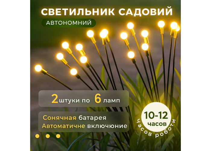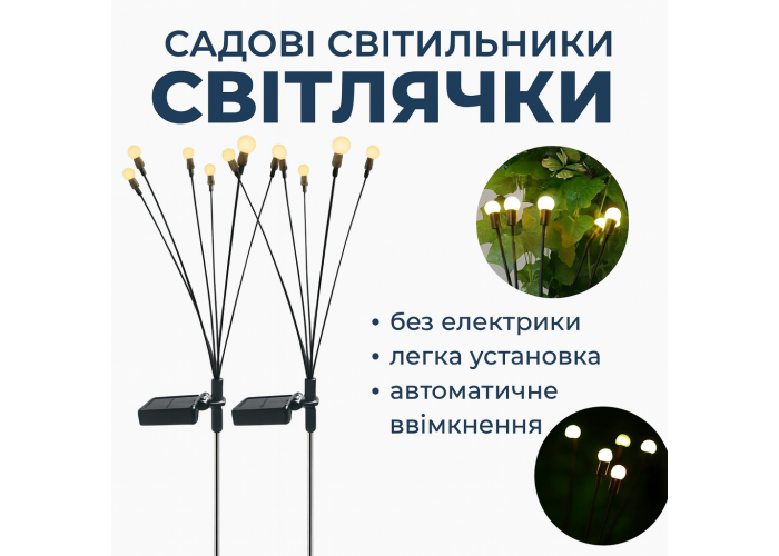 Садові ліхтарі на сонячній батареї «Світлячки» — це декоративне вуличне освітлення для саду, доріжок і клумб, яке створює затишну атмосферу без під'єднання до електромережі. Ліхтарі автоматично вмикаються з настанням темряви та м'яко підсвічують ділянку, імітуючи ефект світних вогників.