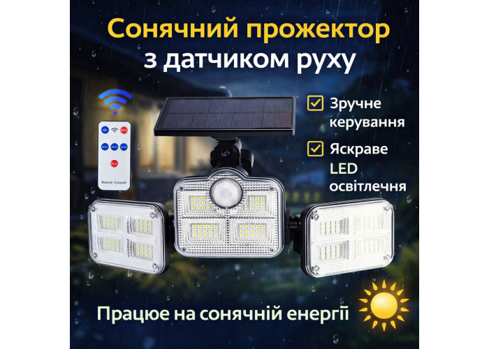 Сонячний вуличний світильник Solar Lights Outdoor з 122–138 LED — це автономна лампа для зовнішнього освітлення, яка працює від сонячної енергії й не потребує підключення до електромережі. Світильник оснащений потужною сонячною панеллю, датчиком руху PIR та автоматичним режимом увімкнення в темряві. Корпус із захистом IP65 дозволяє використовувати лампу за будь-якої погоди: дощ, сніг, вітер. Підходить для освітлення двору, саду, тераси, паркану, гаража чи входу до будинку.