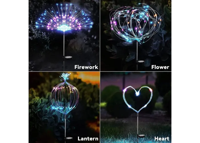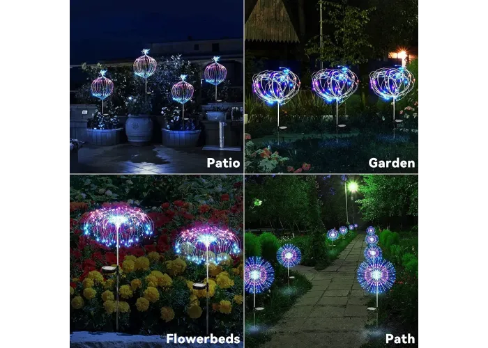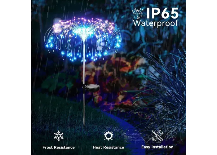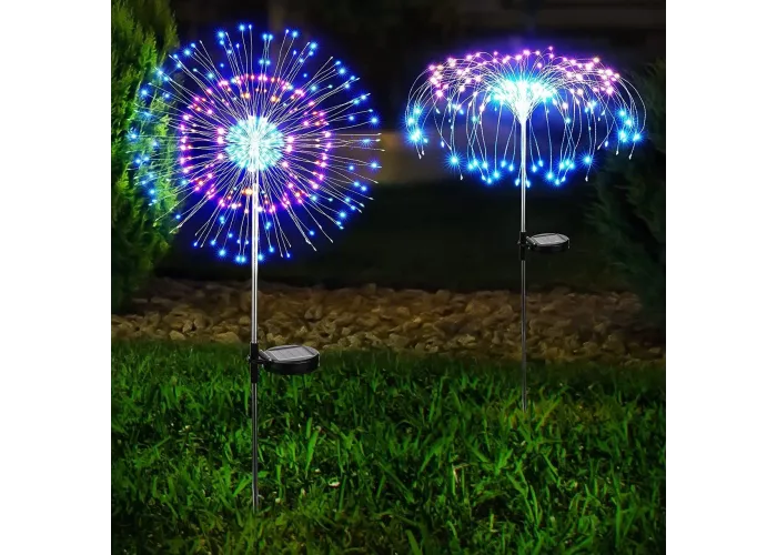 Створіть чарівну атмосферу у своєму дворі або саду з декоративним вуличним світильником «Фейєрверк». Завдяки яскравому світінню в синіх і рожевих тонах, він перетворює будь-який простір на святкове та казкове. Кожен світильник обладнаний 200 світлодіодами, рівномірно розподіленими за гнучкими мідними лініями, які надають ефект розпуску салюту в небі.
