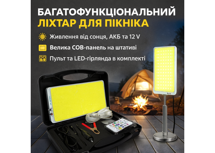 Яскраве заливальне світло: Велика COB-панель забезпечує рівномірне освітлення великої площі. Ідеально для освітлення поляни, наметового містечка або місця ремонту авто.