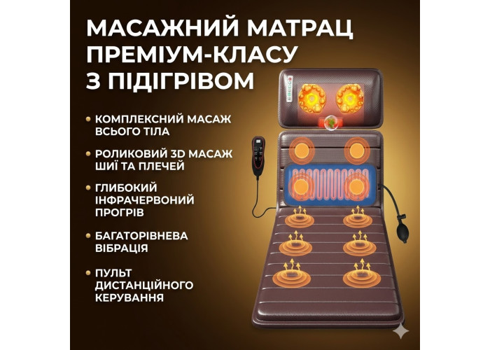 Опис Багатофункційний масажний матрац — це ідеальне рішення для повноцінної релаксації та відновлення організму в домашніх умовах. Пристрій забезпечує комплексний вплив на всі ключові зони: шию, плечі, спину, поперек і ноги. Завдяки комбінації інтенсивної вібрації та функції глибокого інфрачервоного прогрівання, матрац ефективно знімає м'язові спазми, покращує кровообіг і допомагає боротися з наслідками стресу або фізичного перевтоми. Складана конструкція дає змогу легко зберігати прилад і використовувати його на ліжку, дивані або навіть на підлозі, перетворюючи будь-який простір на зону професійного SPA-масажу.