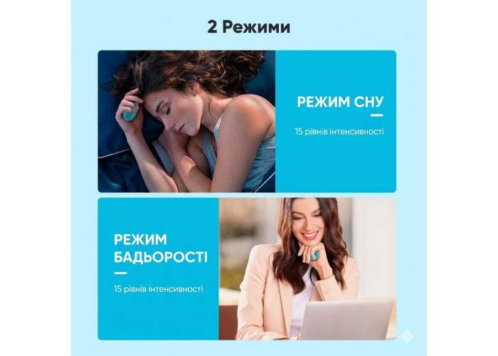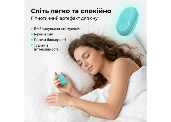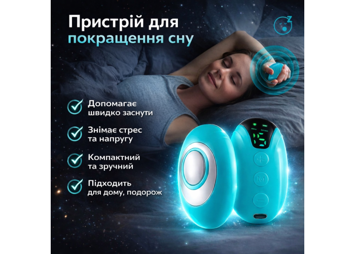 Портативний пристрій Supretto для покращення сну — компактний електронний гаджет, який допомагає швидше заснути та знизити рівень стресу без медикаментів. Він використовує мікротоки EMS для м’якої стимуляції нервової системи і має 15 режимів інтенсивності, що дозволяють підібрати оптимальний для індивідуальних потреб. Пристрій також оснащений заспокійливою світловою підсвіткою, яка сприяє природній виробці гормону сну — мелатоніну. Працює від акумулятора з USB-зарядкою, легко переноситься і може використовуватися вдома, у дорозі чи в офісі.