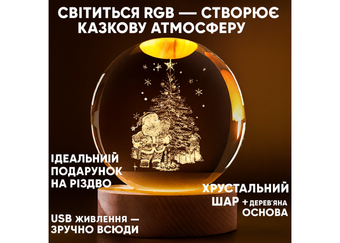 Куля виготовлена з якісного прозорого скла, а підставка — з натурального дерева, що робить аксесуар стильним доповненням будь-якого інтер'єру. Підсвітка плавно змінює кольори (RGB), занурюючи кімнату в казкове сяйво.