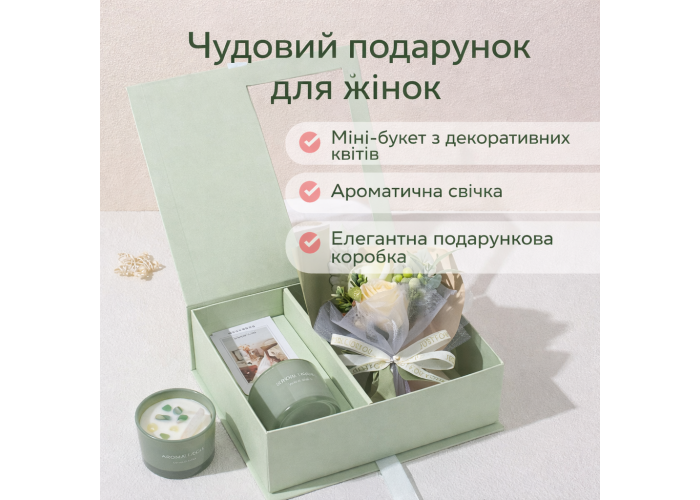 Подарунковий набір KR-15 — стильний і універсальний подарунок, який поєднує в собі декоративний букет квітів і ароматичну свічку, акуратно розміщені в преміальній подарунковій коробці з прозорим віконцем. Композиція має естетичний, гармонійний вигляд і не вимагає додаткового оформлення — набір повністю готовий до вручення.