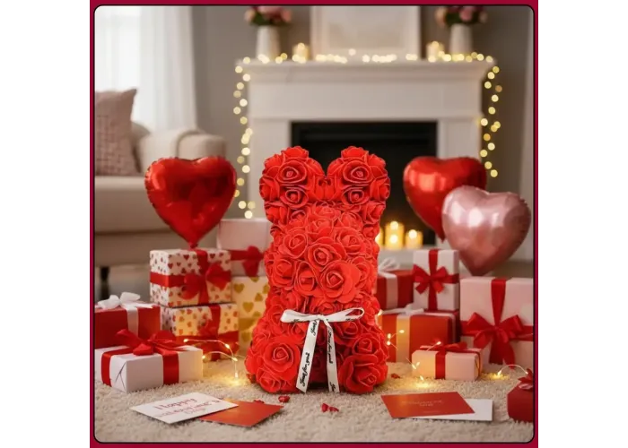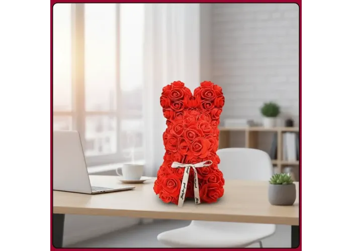 Подарунок «Зайка з троянд» — це оригінальний декоративний виріб, виготовлене з безлічі маленьких штучних трояндочок, акуратно зібраних у форму милого зайця. Такий подарунок має ефектний та ніжний вигляд, відразу привертаючи увагу та створюючи святковий настрій. Кролик доповнений декоративною стрічкою, зав'язаною у формі акуратного бантика, що надає виробу завершеного та подарункового вигляду.