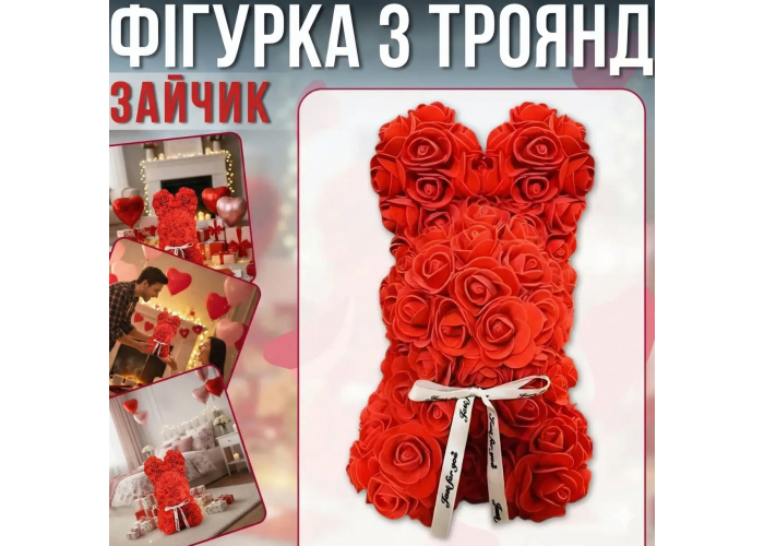 Подарунковий "Зайчик" з декоративних троянд і бантиком 17х17х25 см KR-21 Квітковий зайчик із 3D-роз Оригінального подарунка