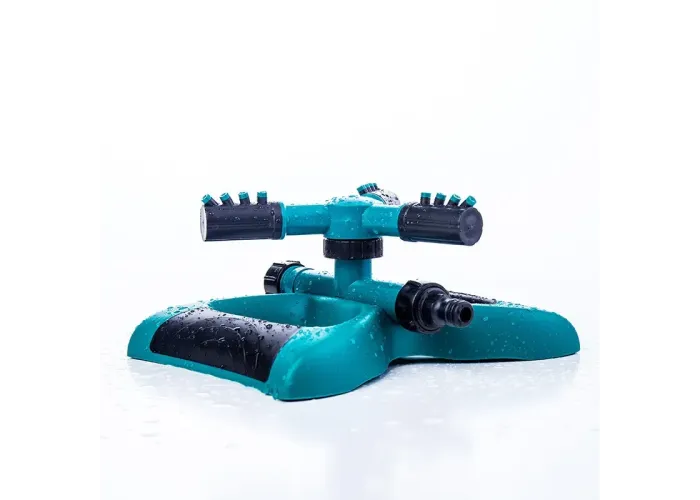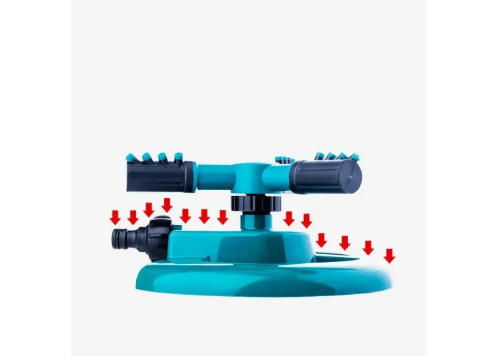 Розбризкувач має стійку конструкцію, яка встановлюється прямо на землю без потреби забивати її молотком. Крім того, за допомогою обертових наконечників можна регулювати зону роботи та відстань поливання. Кожен рукав має 4 форсунки в різних напрямках, що дає змогу поливати на відстані приблизно 15 м і поливати площу приблизно 175 м2 залежно від напору води.