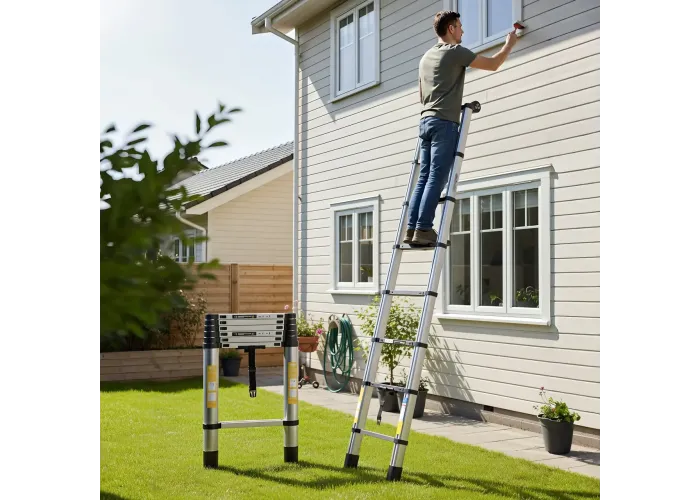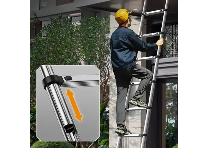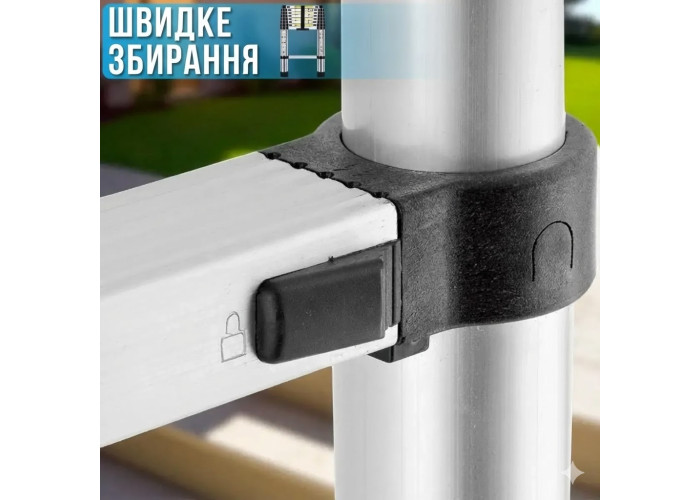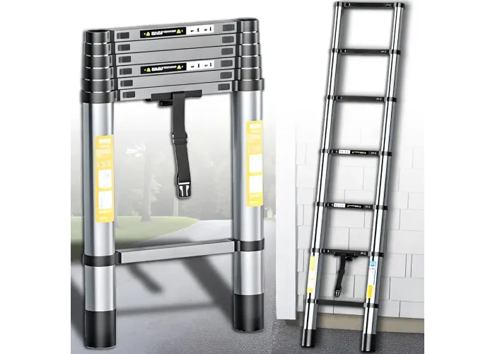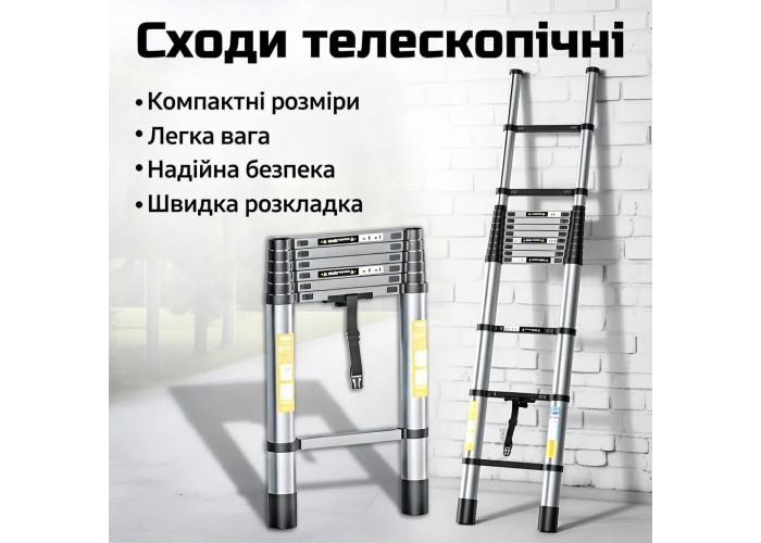 Компактна телескопічна драбина заввишки 2.7 м із міцної хромомолібденової сталі. Швидко розкладається і складається за секунди, регулюється за висотою. Ідеальна для квартири, дому, дачі, ремонту, монтажу та побутових робіт. У складеному вигляді займає мінімум місця (78×45 см), легко поміщається в багажник авто або комору. Протиковзні рифлені щаблі та наконечники гарантують максимальну безпеку та стійкість. Надійна фіксація на будь-якій висоті, витримує до 150 кг. У комплекті зручний ремінець для перенесення та фіксації.Преімучества
