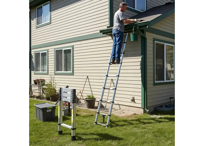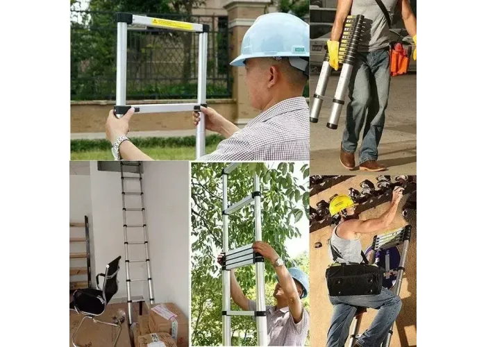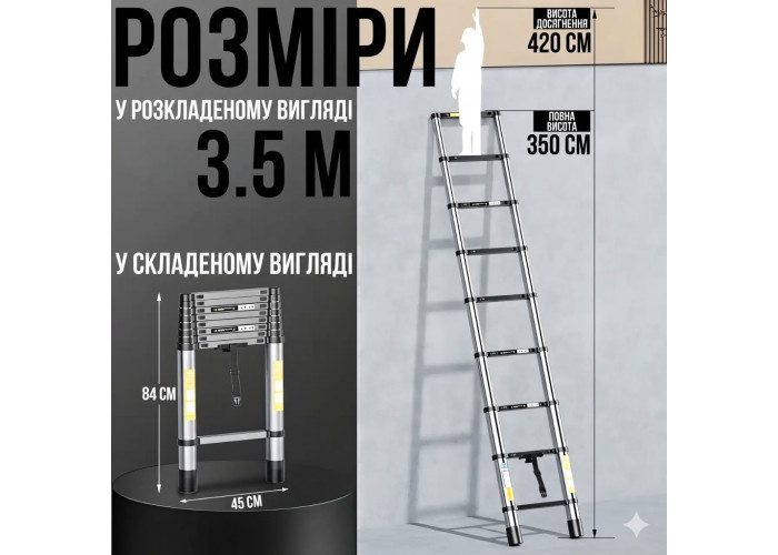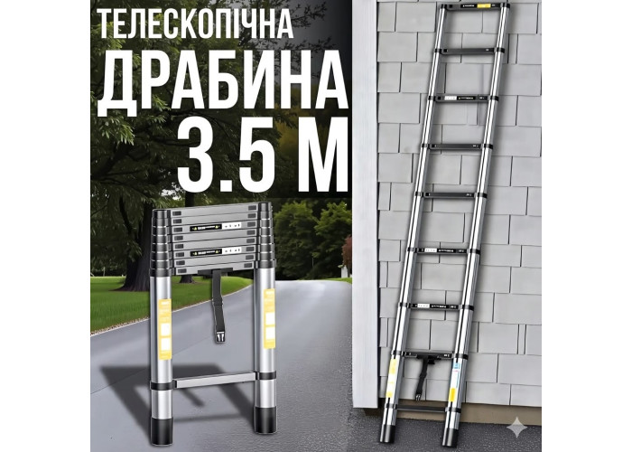 Телескопічна драбина висотою 3.8 м з 12 ступенями з міцного авіаційного алюмінію. Швидко розкладається та складається за лічені секунди, регулюється по висоті з надійною фіксацією. Ідеально підходить для високих робіт у квартирі, будинку, на дачі, для ремонту, монтажу, прибирання, заміни ламп, догляду за деревами. У складеному вигляді — лише 78 см, легко поміщається в багажник автомобіля, комору чи шафу. Протиковзкі рифлені ступені та гумові наконечники забезпечують максимальну безпеку. Витримує навантаження до 150 кг. У комплекті зручний ремінь для фіксації та перенесення.Переваги