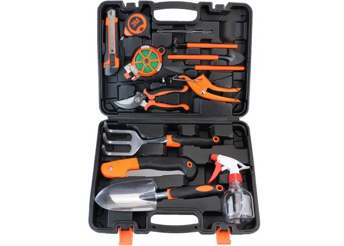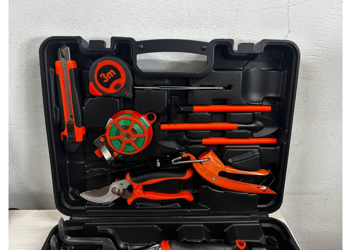 Садовий набір у кейсі 14в1 являє собою універсальний комплект, що ідеально підходить для догляду за садом та городом. До набору входять різноманітні інструменти, які допоможуть вам ефективно виконувати всі необхідні завдання — від посадки та пересадки рослин до обрізання та розпушування ґрунту.