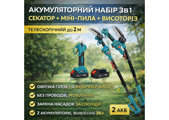 Акумуляторний набір 3в1 AUTOO — універсальне рішення для догляду за садом, деревами та кущами. У комплект входять три корисні інструменти: акумуляторний секатор, міні-пила та телескопічний висоторіз. Такий набір дозволяє виконувати широкий спектр робіт швидко, зручно та без зайвих зусиль.