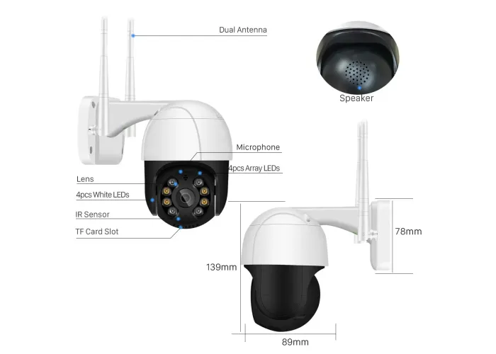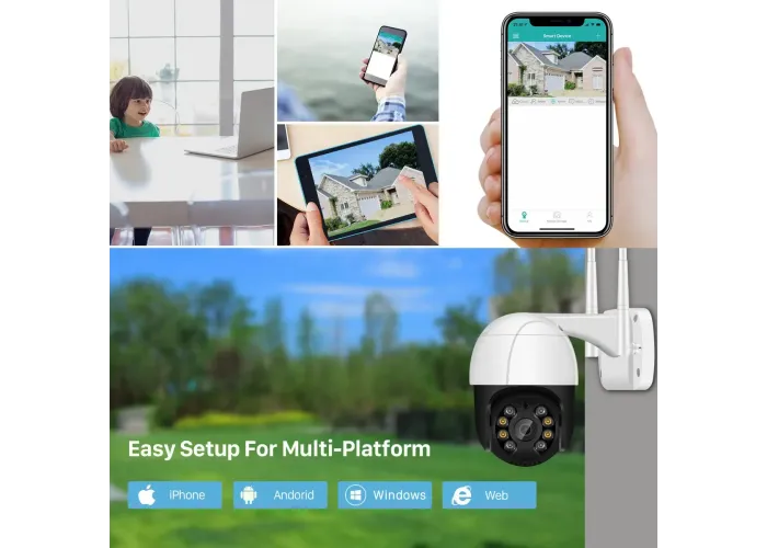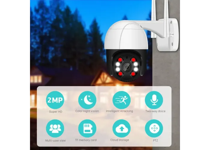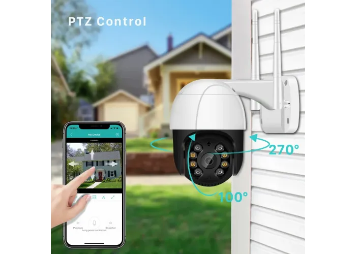 Вулична бездротова IP Wi-Fi PTZ Камера Онлайн відеоспостереження встановлюється й налаштовується за 2-5 хвилин і замінює дві-три звичайні стаціонарні камери спостереження. Кут за горизонталлю 320°, за вертикаллю 90°. Кріпимо на стіні, на смартфон гойдаємо програму. Кілька хвилин на настроювання і Ви отримуєте зображення з камери на свій смартфон.