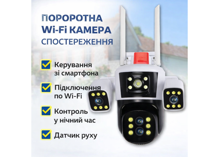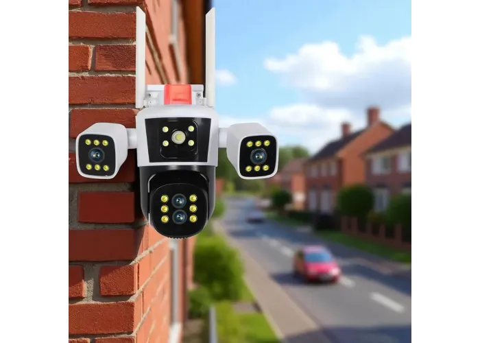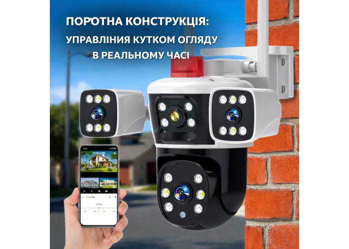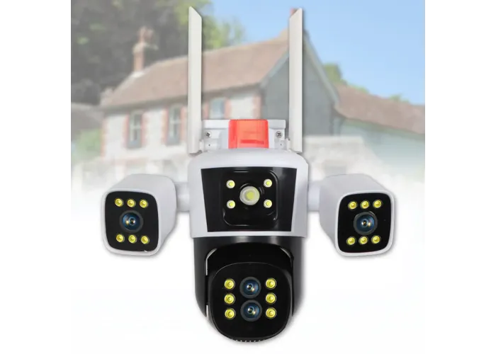Сучасна IP-камера призначена для цілодобового відеоспостереження з високою роздільною здатністю та широким кутом огляду. Завдяки трьом вбудованим об'єктивам і поворотній PTZ-системі пристрій охоплює відразу кілька зон одночасно, передаючи чітке зображення навіть в умовах слабкого освітлення. Камера підтримує технологію WiFi, що дає змогу переглядати трансляцію в реальному часі з будь-якого пристрою. Наявність функції нічного бачення й інфрачервоного підсвічування робить її універсальною для використання як усередині приміщень, так і на вулиці.