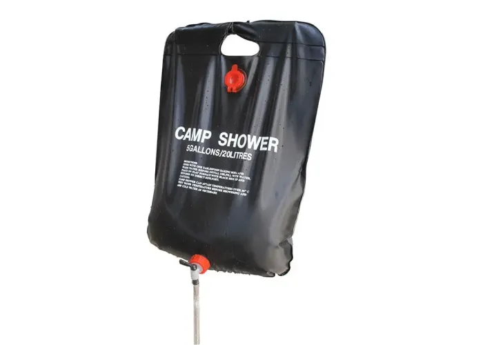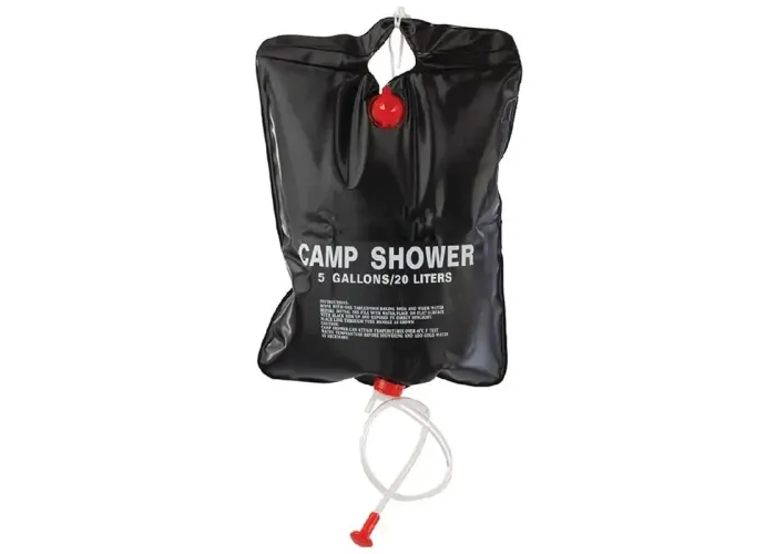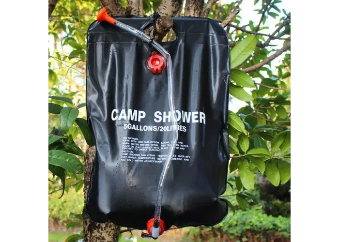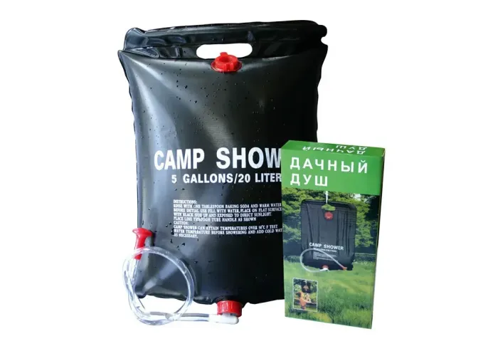 Душ для походу складається з пластикової ємності об'ємом 20 літрів і розпилювача струменя. Кількість води рівного 20 літрів вистачить на 10 хвилин безперервної роботи. Якщо використовувати воду економно, то помитися може не один, а кілька людей.