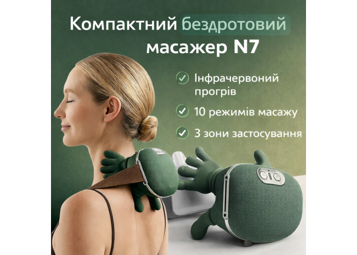 Компактний бездротовий масажер N7 призначений для розслаблення м'язів шиї, плечей, спини, рук та інших зон тіла. Пристрій обладнаний інфрачервоним підігрівом, який підсилює дію масажу та допомагає зняти напруження. Бездротовий формат і вбудований акумулятор роблять масажер зручним для використання вдома, в офісі або в поїздках. Заряджання здійснюється через USB-кабель. Масажер пропонує 10 режимів роботи, даючи змогу підібрати комфортну інтенсивність.