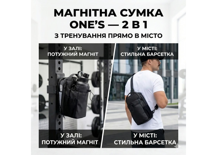 Опис Магнітний підсумок One's — це інноваційний аксесуар, розроблений спеціально для активних людей і шанувальників фітнесу. Головна особливість сумки — потужний вбудований магніт, який дає змогу миттєво закріпити її на будь-якій металевій поверхні: тренажерах, рамах, шафках або навіть на кузові автомобіля. Вам більше не потрібно ставити пляшку з водою або телефон на брудну підлогу в спортзалі — тепер ваші речі завжди на рівні очей і під рукою. Попри компактні розміри, підсумок дуже місткий і легко замінює повсякденну барсетку, даючи змогу носити його через плече завдяки регульованому ременю.