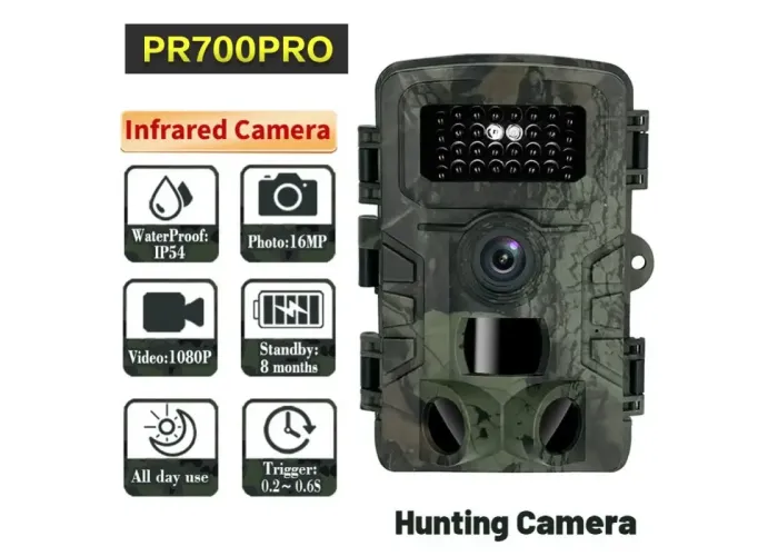 Фотолівка PR700PRO мисливська камера IP66 12mp з екраном і нічним баченням використовується для охорони територій, спостереження за тваринами та людьми. Це надійний і зручний засіб для полювання й спостереження за дикою природою. Забезпечена камера має IP66 клас захисту, що забезпечує її стійкість до вологи, пилу та зовнішніх впливів, роблячи її ідеальним вибором для використання на свіжому повітрі в будь-яких погодних умовах.