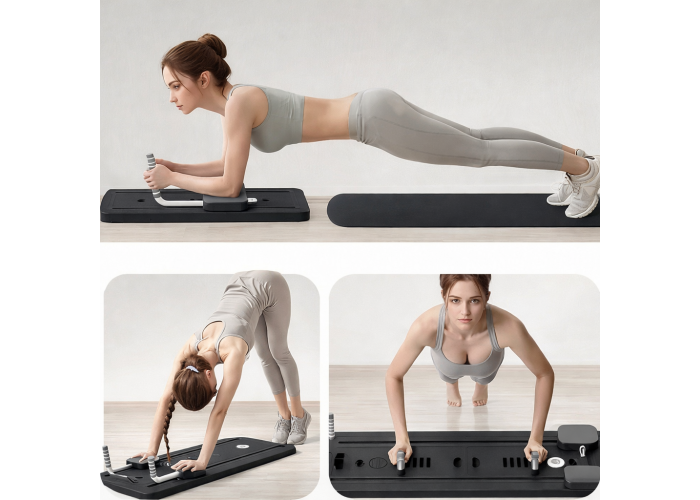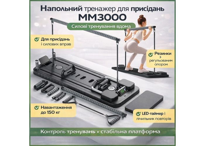 Напольний тренажер MM3000 — це багатофункціональна силова платформа з резинками, розроблена для виконання присідань, вправ для ніг, сідниць, преса та рук у домашніх умовах. Конструкція дозволяє тренувати основні групи м’язів без відвідування спортзалу.