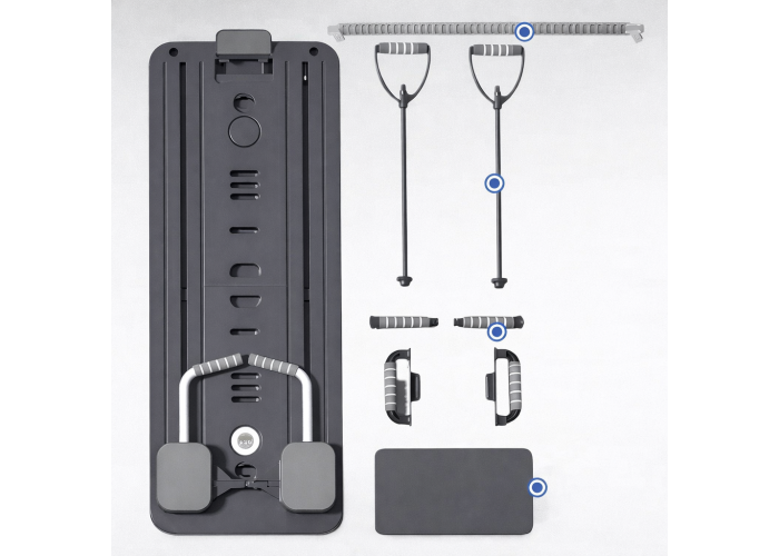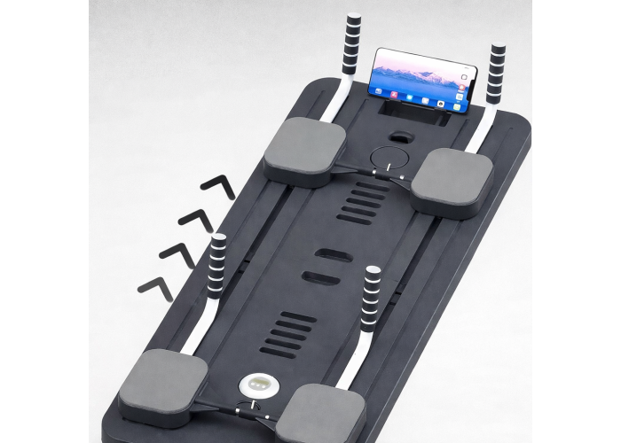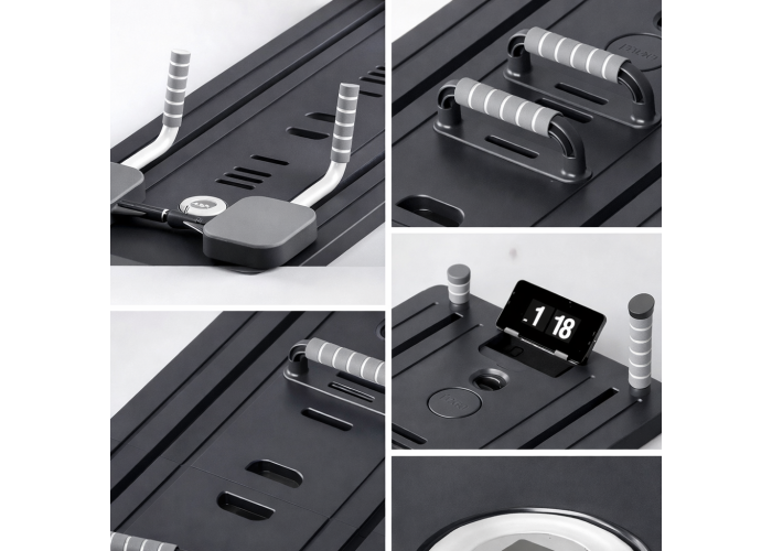Модель оснащена системою опору з еластичними резинками та вертикальними стійками, що створюють контрольоване навантаження під час виконання вправ. Вбудований LED-таймер і лічильник повторів допомагають відстежувати прогрес тренувань.