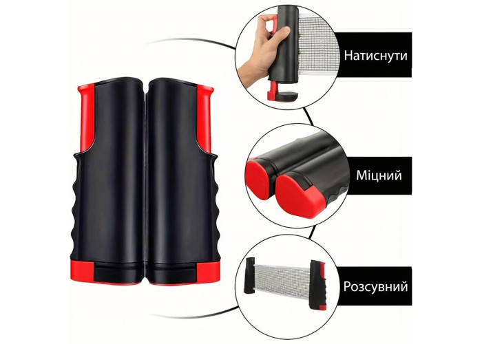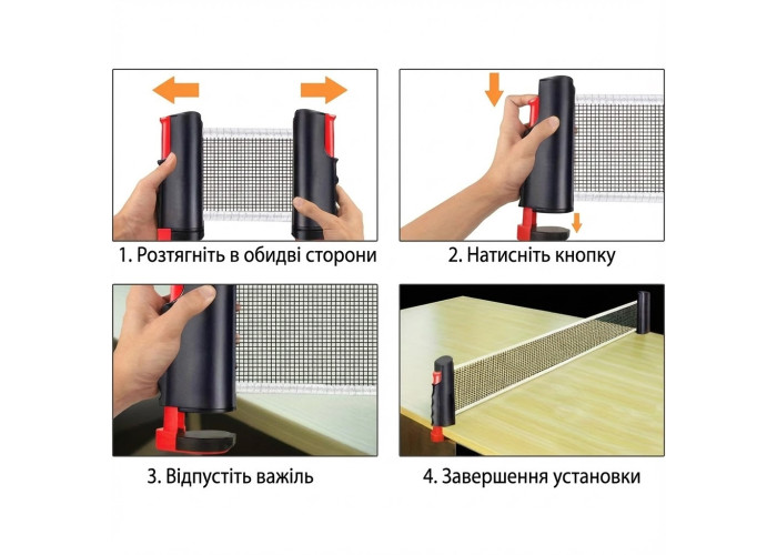Портативний набір для настільного тенісу M195 дає змогу за кілька секунд перетворити будь-який стіл на повноцінний тенісний стіл. Розсувна сітка швидко фіксується на краях стільниці, а компактні розміри набору роблять його зручним для дому, офісу, дачі або подорожей. Чудовий варіант активного відпочинку для дітей і дорослих, тренування реакції та координації.