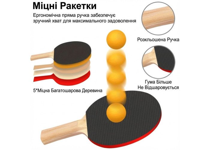 Набір підходить як для аматорської гри в колі родини, так і для дружніх матчів в офісі. Ракетки зручно лежать у руці, забезпечують гарний контроль за м'ячем, а сітка надійно тримається й не дряпає поверхню стола.