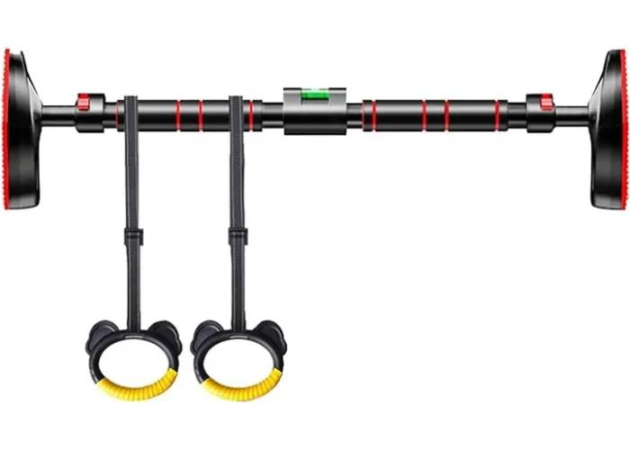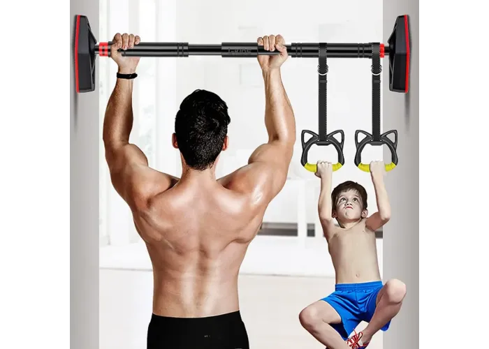 Це переносний регульований турнік без гвинтів для встановлення у дверний отвір, завширшки від 60 до 103 см. Він чудово підходить як для дорослих, так і для дітей завдяки наявності в комплекті підвісної гойдалки та гімнастичних кілець. Турнік не вимагає свердління стін і легко встановлюється без інструментів — досить закріпити його в отворі за допомогою вбудованого нарізного механізму. Ідеальний для домашнього використання, допомагає розвивати силу, витривалість і координацію в всієї родини.