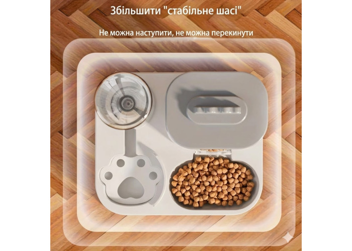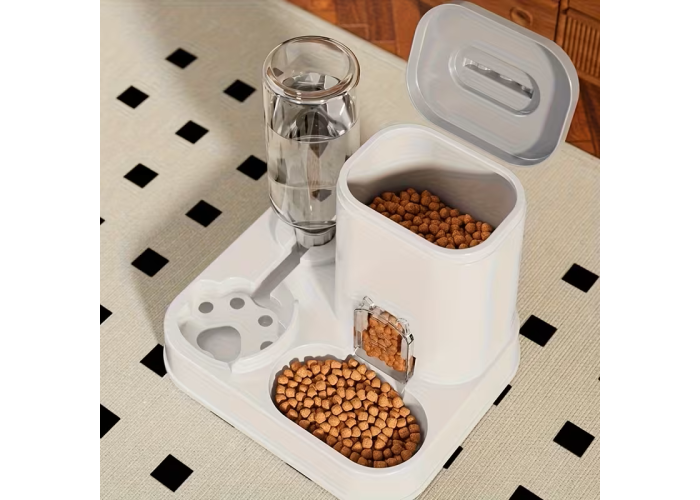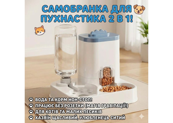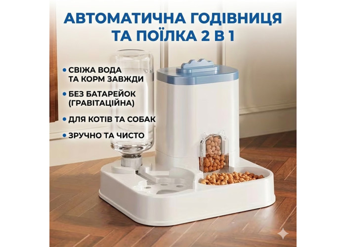 Автоматична годівниця 2 в 1 — зручне рішення для щоденного годування кішок і собак. Поєднує в собі диспенсер для сухого корму та поїльник для води, що працюють за гравітаційним принципом. Не потребує під'єднання до мережі та батарейок, підходить для дому та квартири.