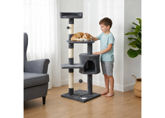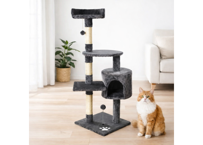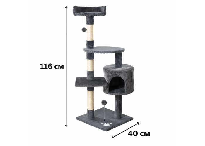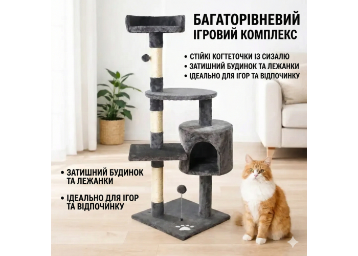 Комплекс має оптимальні габарити 116х40х40 см, даючи змогу ефективно використовувати простір навіть у невеликих кімнатах. Завдяки стриманому сірому відтінку аксесуар має стильний та сучасний вигляд. Подаруйте пухнастому другові особисту міцність, де комфортний відпочинок поєднується з веселими пригодами.