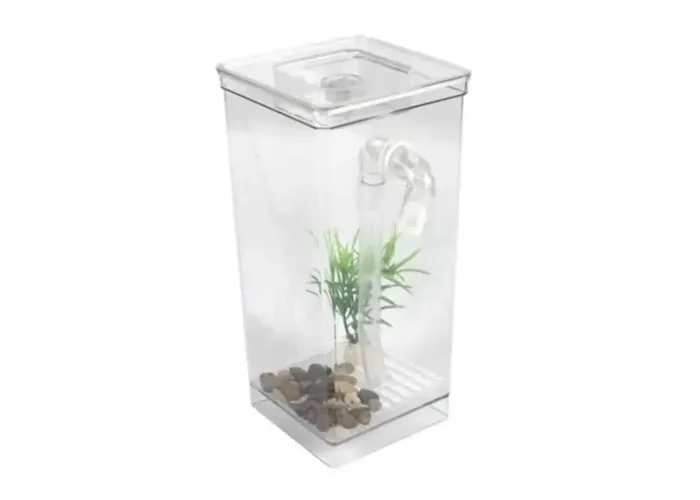 Акваріум виготовлений із прозорого ударостійкого пластику. До комплекту входить усе необхідне для його встановлення, зокрема камені на дно й одна рослина. Вам залишається тільки придбати рибку та налити води.
