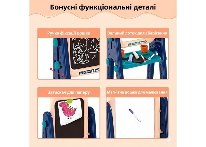 4в1: малювання маркерами, малювання крейдою, магнітна дошка для літер/цифров і навчальних ігор, закріплення аркушів паперу для звичайних малюнків.