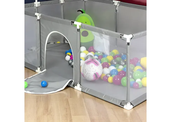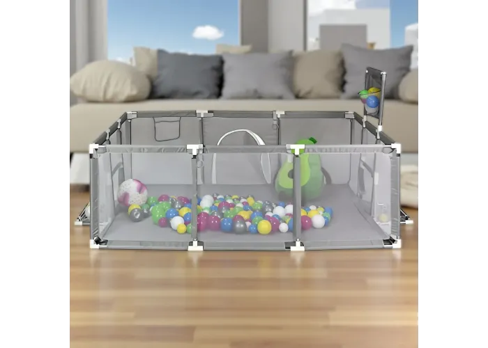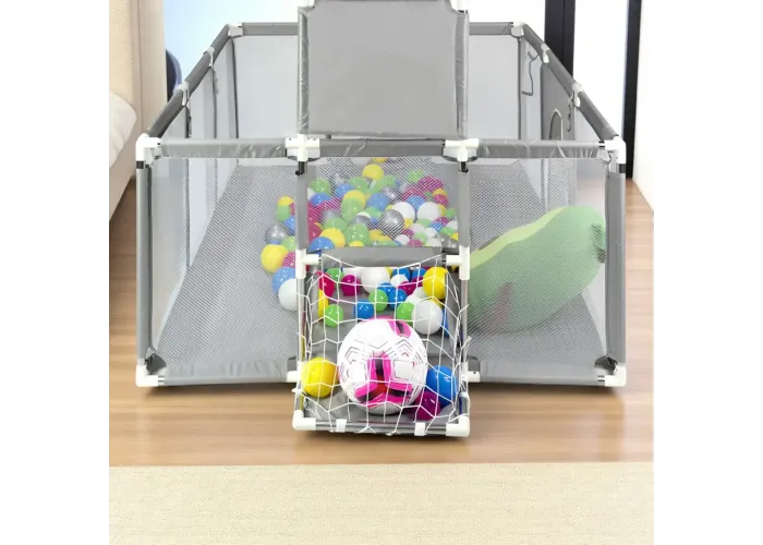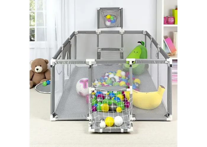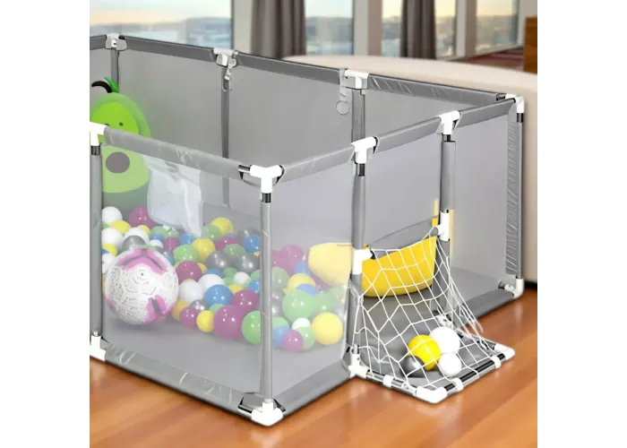 Манеж обладнаний баскетбольним кільцем і воротами, що робить його універсальною ігровою зоною. Виготовлений із гіпоалергенної тканини, безпечної для ніжної шкіри дитини. Легке складання дає змогу швидко встановити манеж вдома або взяти із собою в поїздку. Стильний сірий колір гармонійно вписується в будь-який інтер'єр і підходить як для хлопчиків, так і для дівчаток.
