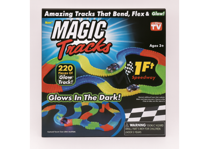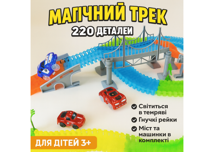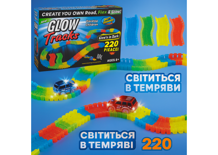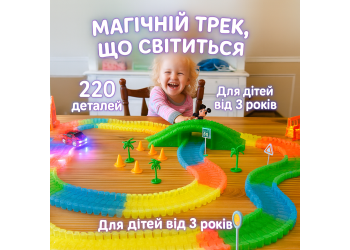 Яскрава перегонова траса з 220 деталей стане улюбленою іграшкою кожного малюка від 3 років. Гнучка траса легко вигинається, утворюючи найхимерніші повороти, а також світиться в темряві!