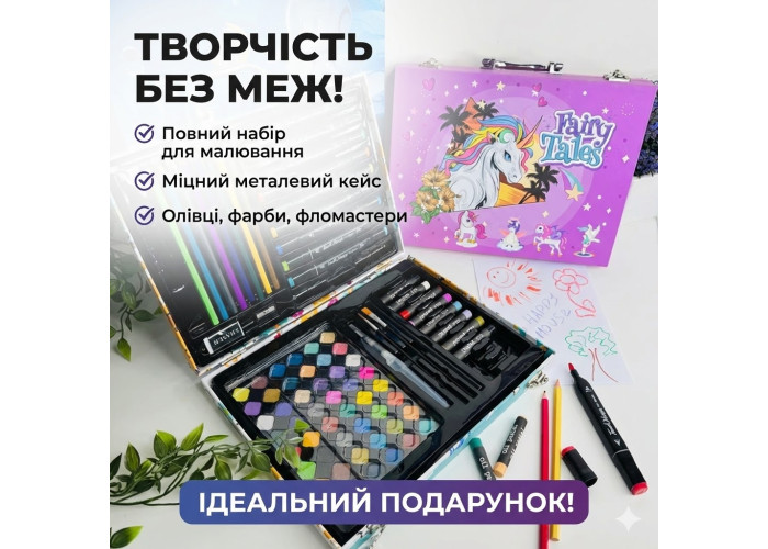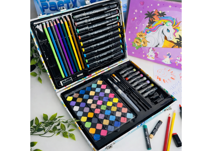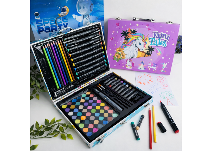 Художня металева валіза для малювання — це універсальний набір для творчості, який містить 85 предметів для малювання, розфарбовування та художнього розвитку. Комплект ідеально підходить для дітей, підлітків і художників-початківців, даючи змогу створювати малюнки в різних техніках удома, у школі або в дорозі.
