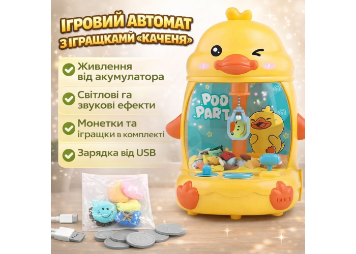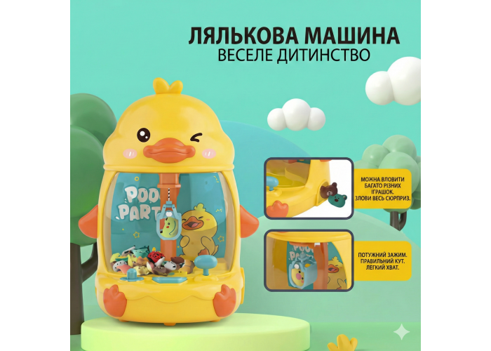 Ігровий автомат «Циплівка» — інтерактивна та весела іграшка, яка подарує дітям безліч яскравих емоцій. Яскравий жовтий корпус, виготовлений у формі симпатичного курчати, миттєво приверне увагу дітей. Автомат обладнаний зручними кнопками та ергономічними важелями керування, що ідеально підходять для маленьких дитячих ручок. Під час гри дитина буде захоплена процесом лову іграшок, розвиваючи дрібну моторику, координацію та швидкість реакції. Вбудовані світлові ефекти та веселі мелодії створюють атмосферу справжнього свята та роблять ігровий процес ще цікавішим. Автомат працює як від чотирьох батарейок типу AA, так і мережі, що забезпечує зручність використання в будь-яких умовах. Завдяки зручній конструкції в автомат можна легко додавати власні невеликі іграшки або цукерки, у такий спосіб урізноманітнюючи ігровий процес. Такий автомат стане чудовим подарунком, який принесе масу радості й усмішок дітям різного віку.