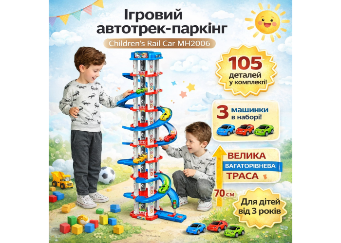 Children’s Rail Car MH2006 — це багаторівневий ігровий автотрек-паркінг, що складається зі 105 елементів та дозволяє зібрати високу вертикальну трасу з парковочними рівнями та спусками.