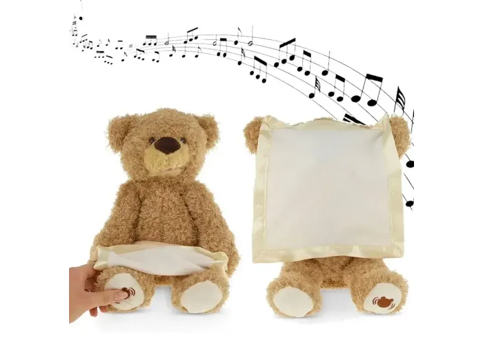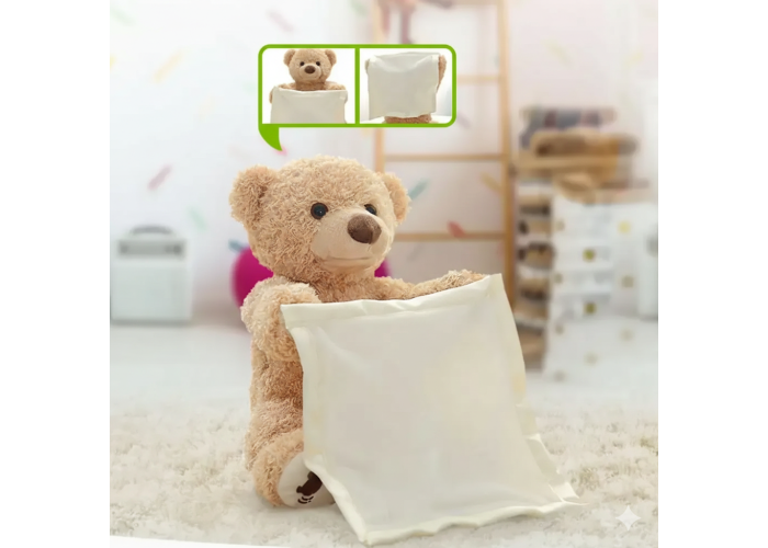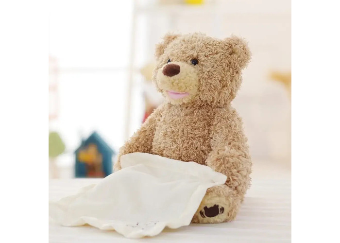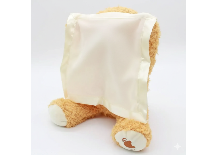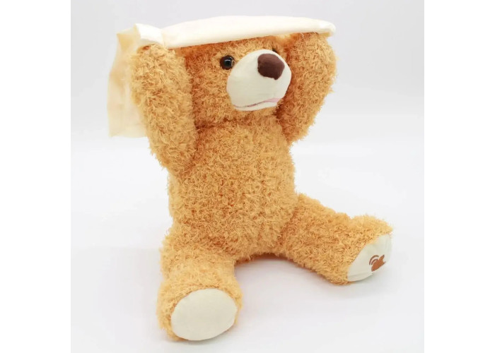 Ведмедик виготовлений у формі чарівного ведмежати з хусткою в лапках. Ведмедик грає в хованки, виготовлений із високоякісного штучного хутра та має м'який наповнювач, завдяки чому буде безпечний для дитини. Ця інтерактивна іграшка. Натисніть на лапку ведмедика, і він пограє з дитиною в гру, ховаючись за хусткою.