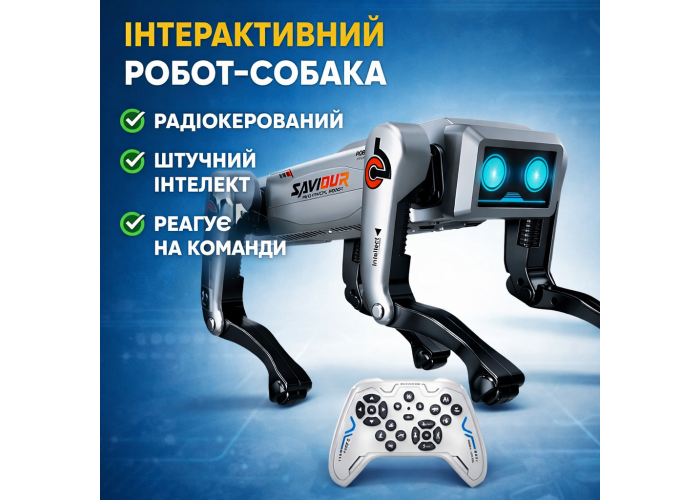 Робот-собака, пульт дистанційного керування, USB-кабель для заряджання.