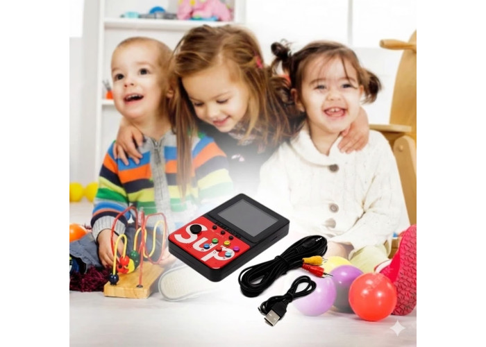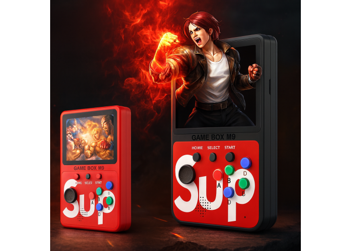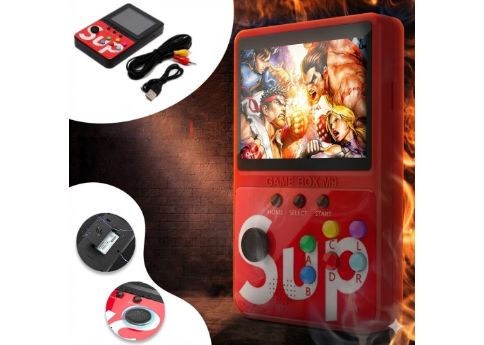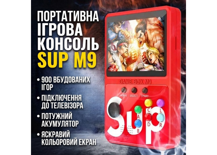 Sup M9 — компактна ігрова приставка з 900 вбудованими ретро-іграми. Зручна в дорозі, вдома або як подарунок. Працює автономно від акумулятора, підтримує під'єднання до телевізора.